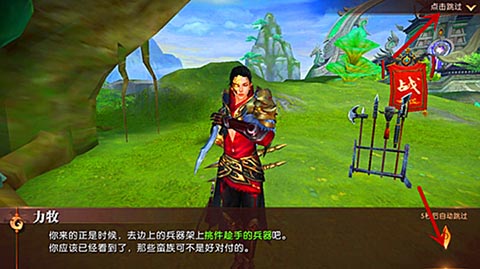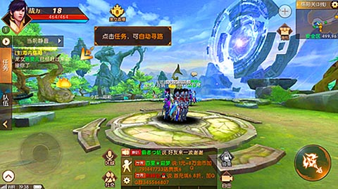 进入游戏我们可以看到一个大大的箭头“点击任务,可自动寻路”,就是这么简单,接下来,包括以后任何任务只需点击一下,就可以自动进行了,无需多余操作。