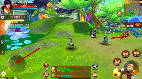 在游戏画面中,你所控制的角色位于屏幕中央位置附近。移动位置时,拖曳左下角带有四个箭头的圆圈,可以自由行走。点击自动可以自动战斗,切怪可以切换攻击目标。