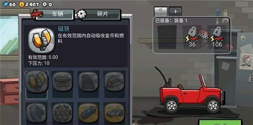 4、在部件系统里,可以对汽车增加一些新的部件,增加汽车的性能。在新手阶段,我比较推荐带重型、磁石、着陆助推力三种部件。重型,可以增加赛车的重量,降低赛车的重心,使赛车在行驶时能够更加的平稳。磁石,可以收集燃料和半径更宽的金币,可以更快的积累足够的金币来对赛车进行改造升级。着陆助推器,可以在赛车跳跃落以后,获得一段冲刺,拉开与其他赛车的距离,获得更高的评价。