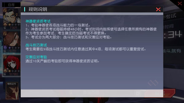 神器使资质考试是一个全新的单人挑战玩法,将对神器使各项战斗能力进行测试。考试只在特定的时间内开放,指挥使们可选择任意拥有的神器使作为考生参加。考试分为两大部分,战斗技巧测试和灾害应对考验。