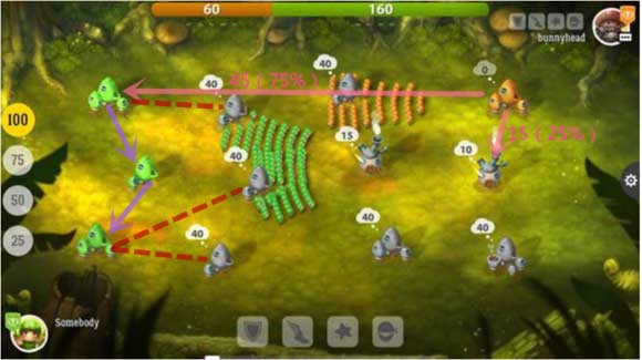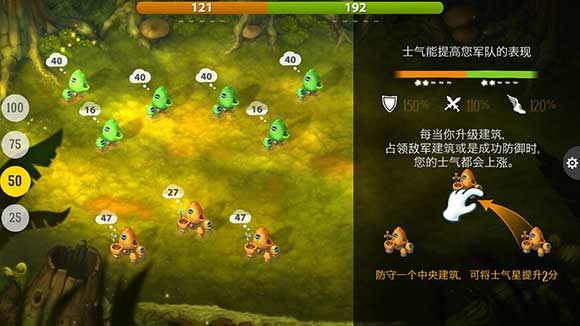 最后,当建筑物一半以上都满3级或占领对方领土达70%时,就可以调整出兵的百分比为75%,加速攻击的力度。