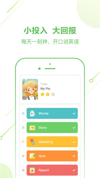 针对儿童语言特征设计的智能口语测评系统,能够自动识别发音和评分。鼓励孩子在阅读之余大声开口说英语、讲故事,锻炼孩子的英语口语能力。