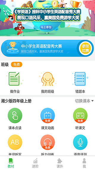 1、包含了教材同步点读和配套影音,并有语音测评、单词听写、听力训练和趣味练习等多样化的练习与测试,以及微课堂、绘本阅读和配音等特色模块。