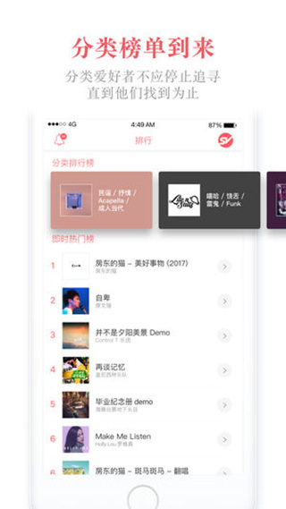 1、24 小时“即时热门榜”,让你掌握原创音乐圈的指标性榜单。