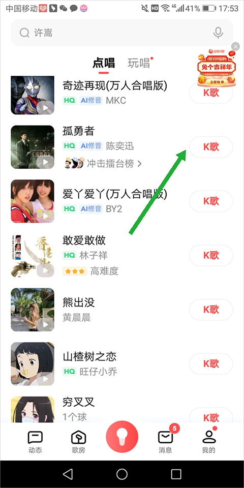1、用户进入点唱页面中选择想要唱的歌曲,点击右侧的【K歌】