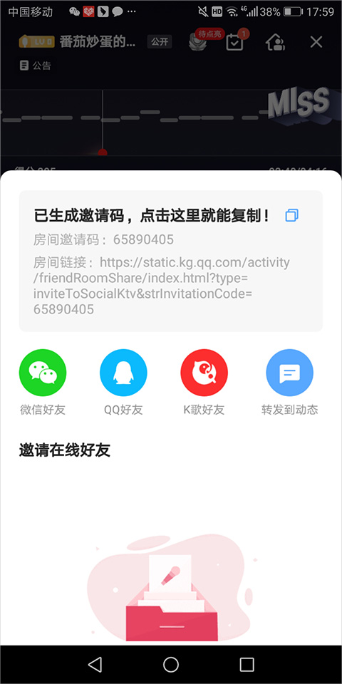 然后软件会生成邀请码和房间的链接地址,用户只需要将这些信息转发给好友即可