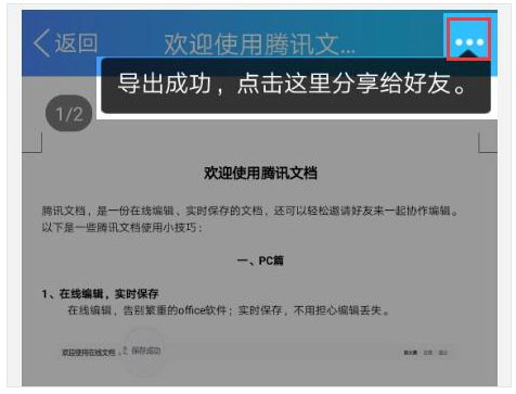 3)导出成功后,可点击右上角「 … 」,选择发给好友/存到微云/打印/用其他方式打开等。