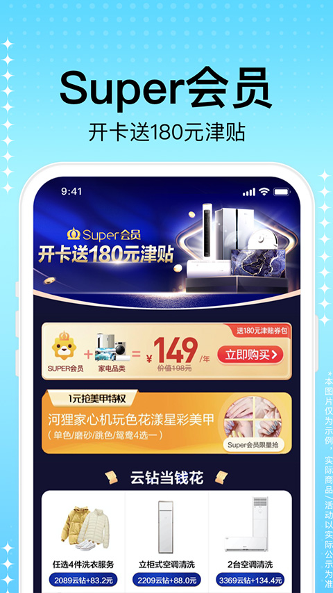 SUPER会员是苏宁为高端用户打造的特权会员体系,开通SUPER会员可尊享内容:会员津贴、最高20倍云钻、专属购物券、运费券限量抢、Super会员价、生活特权、专属客服、Super Day及多种优先体验特权。