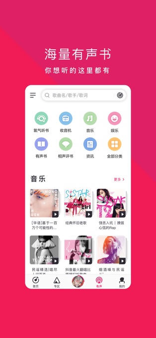 2、有声节目,畅快听书。集合娱乐、儿童、脱口秀、3D体验馆等节目场景,充分消化你的碎片时间;听相声段子,舒缓都市压力烦恼;听小说故事,入眠后好梦相伴。