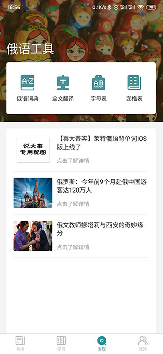 莱特俄语背单词app苹果版是由青岛嘉铭文化传播有限公司研发的一款学习俄语软件,该软件有着每日一句、俄语字母表、俄语题库、俄语资讯、记忆曲线背单词、多题型练习等各种强大的功能,其中就属俄语题库最为好用,该功能有着大量的俄语真题、基础俄语、专四真题、专八真题、国情文化、高级语法等真题,以及在线答题、题目解析、强化训练等学习方式,可以帮助用户将所学的知识重新复习巩固,让您轻松的那高分。并且俄语背单词可以根据用户的俄语水平定来制定学习计划,无论是初学者、入门、高阶都会有相对应的完整教学内容,分别为初学者、进阶学习、考试词汇、我的单词书四个模式,非常适合想去俄国留学、发展、旅游的小伙伴,以及从事翻译工作的人员,有需要的小伙伴不要错过了。