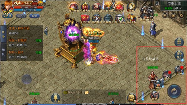 8、系统菜单:包括锻造、神炉、帮会、法神、光翼、官位、好友、成就等功能,可单独进入功能界面执行相关操作。(通过“6切换按钮”切换进入)