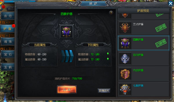 3、护盾不可以进行强化。 点击主界面的神炉系统图标,进入护盾界面:护盾分为10级,等级越高的护盾能够提供给角色更高的物理和魔法防御加成。 低等级的护盾可通过消耗护盾碎片进行升级,进阶为更高等级的护盾。拥有高等级护盾,再也不担心被别人一刀秒杀了。