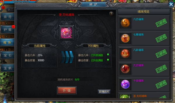 3、魂珠不可以进行强化。点击主界面的神炉系统图标,进入魂珠界面:魂珠分为15个等级,越高等级的魂珠能够提供给佩戴者更高的暴击率与暴击力提升。 低等级的魂珠可以消耗一定数目的魂珠碎片进行升级,提升为高一级的魂珠。
