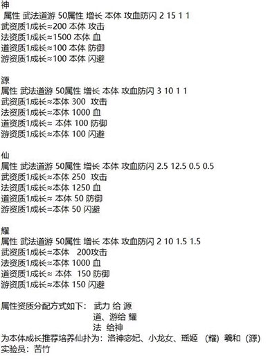 从图中可以看出,不同的仙仆类型,对应本体的属都有着不同程度的反馈,所以最佳的培养方式就是,武力加给源仙仆,法力加给神仙仆,道游加给耀仙仆。