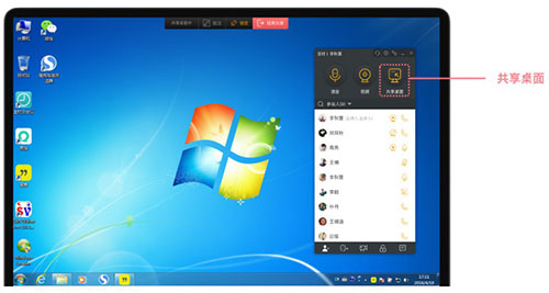 如你是通过电脑/手机入会,会议主讲人点击「共享桌面」按钮即可共享桌面里的任何文档及程序。