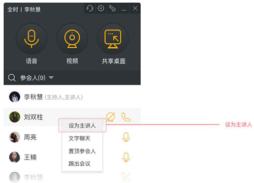 参会人想要共享文档?主持人可通过鼠标右击参会人的名字,将其设置为「主讲人」,参会人获取主讲权限后就可以使用共享功能了。