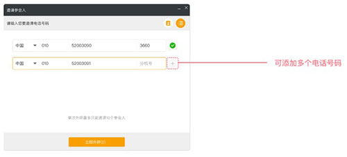 会中想要临时邀请用户入会?主持人可点击「邀请」按钮,输入电话号码点击「立即外呼」,参会人接听电话就可以入会了。支持同时输入多个电话号码,一键外呼入会。