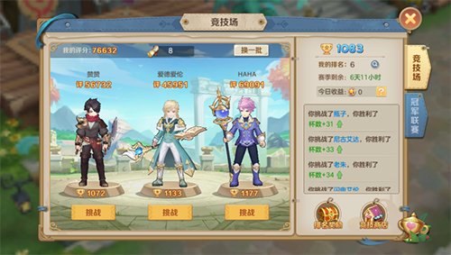 2、进入竞技场画面,共有3名对手可以供你挑选,不满还可以换。可能大家都会关注到自己和对手的评分对比,是不是我的评分高于对手就可以选择他并打赢他呢?NONONO!《云上城之歌》就是不按套路出牌,这么简单就不是好玩的PVP模式了!有时候你的评分高于对手,但是也不一定能打赢对手!有时候你的评分低于对手,也不一定会输给对手!