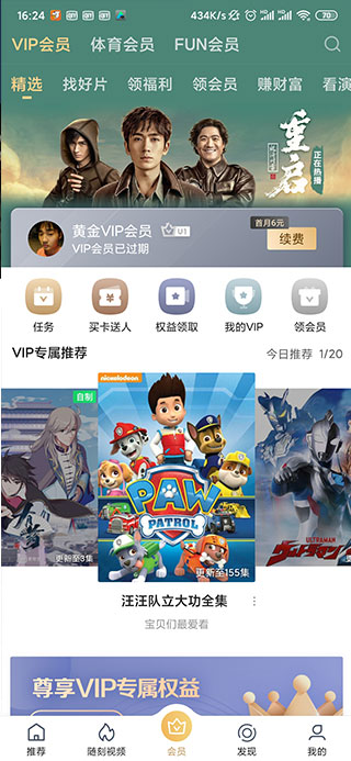 2、然后会看到推荐、随刻视频、会员、发现、我的五个板块,在推荐中有着大量的电视剧供用户观看,并且累计签到还能免费领会员哦!