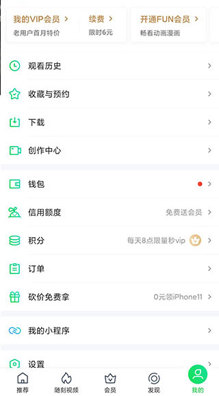 6、在我的中有着观看历史、收藏预约、下载的离线视频、创作中心、钱包等功能: