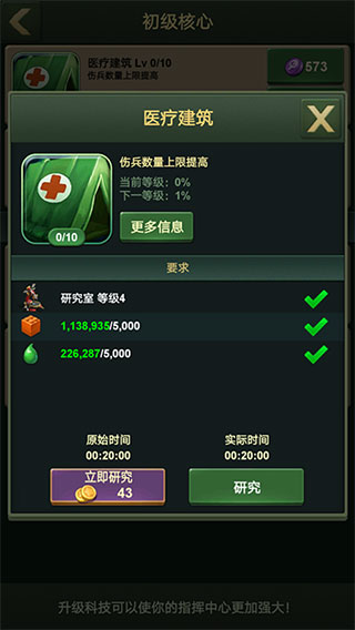 而在研究室研究科技可以提高伤兵数量上限,增加伤兵容量,增加伤兵恢复速度,可全方位提升您的实力。