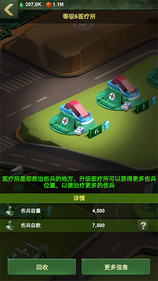 在《兵人大战》手游中,医疗所是玩家救治伤兵的地方,可以快速恢复兵力,是减少伤亡必备的建筑,而升级医疗所则可以获得更多的伤兵位置,以便治疗更多的伤兵。