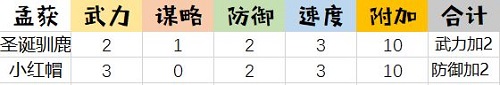 属性:3023,附加防御2点,共计10点,其实防御对于孟获来说很鸡肋,既然是炮灰,就要有炮灰的决心和态度。3点速度和3点武力对孟获的帮助会更大。可以让孟获先手的优势进一步扩大,3点武力对爪击也有一定的提升。