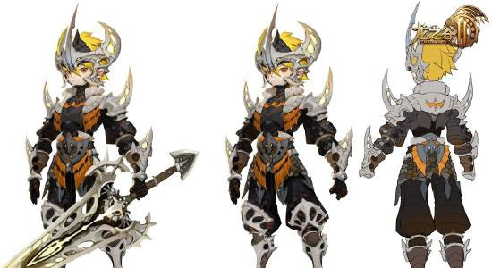 而在战士装中,海龙套被赋予了不同的气质。大块衣料的使用使套装更显气势,海龙眼睛作为装饰嵌入战士的铠甲中 ,平添了几分冷冽气质。皮衣式铠甲塑造了英姿飒爽,战斗坚定的的战士形象,在背后出现的海龙角装饰极大增强了套装的尖锐感,充满攻击性和可靠感的战士海龙套就此诞生。