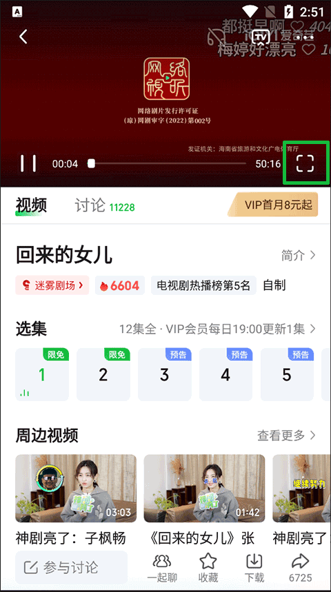 2、在视频播放详情页,点击【全屏播放】按钮。