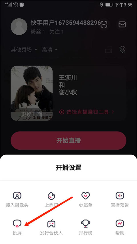 4、进入开播设置界面,选择左下角“投屏”选项,