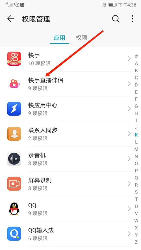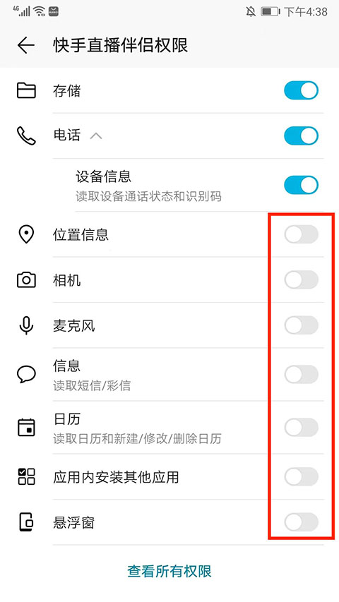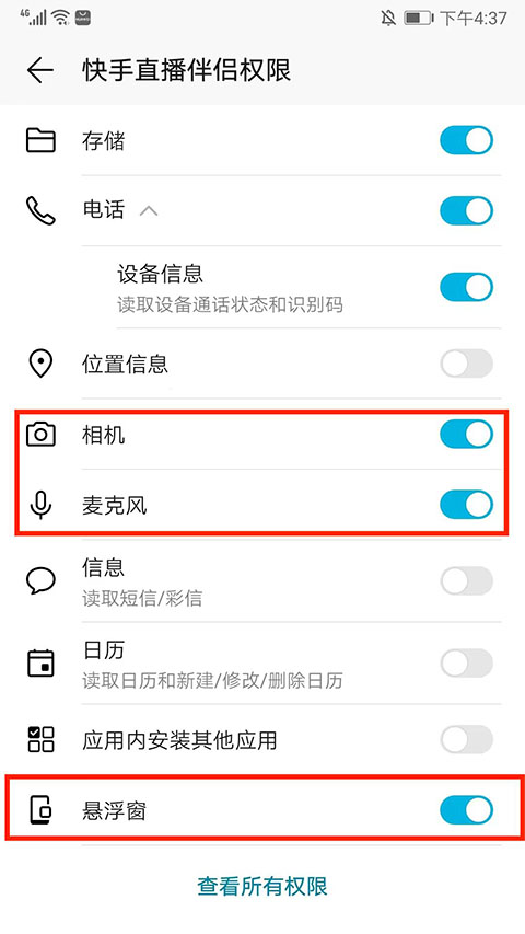 4、进入快手直播伴侣应用权限界面,包括“存储”、“电话”、“位置”“相机”、“麦克风”、“信息”、“悬浮窗”等常用权限。