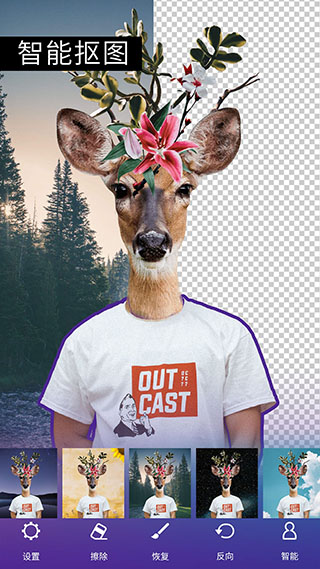 2、在主界面当中能够使用剪刀抠图、擦除背景、艺术滤镜等公共;