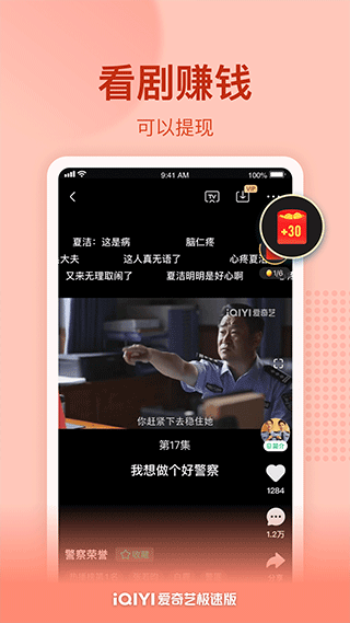 爱奇艺极速版苹果手机版是由爱奇艺推出的一款极简版视频播放软件,覆盖影视剧非常全面,其中各种自制影视综(电影、电视剧、综艺)内容,竖屏小视频、剧情短片多样,还可通过AI算法和智能推荐,为用户兴趣精准推荐个性化视频内容,一秒即可触达感兴趣的视频。而且软件安装包很小,完美解决手机内存不足问题,运行将更加流畅,去除了眼花缭乱的插件,给用户沉浸式观影体验,除此之外,爱奇艺极速版观看热门视频还可以赚取红包,邀请好友得金币也能赚钱,进一步满足了用户视频内容消费需求。