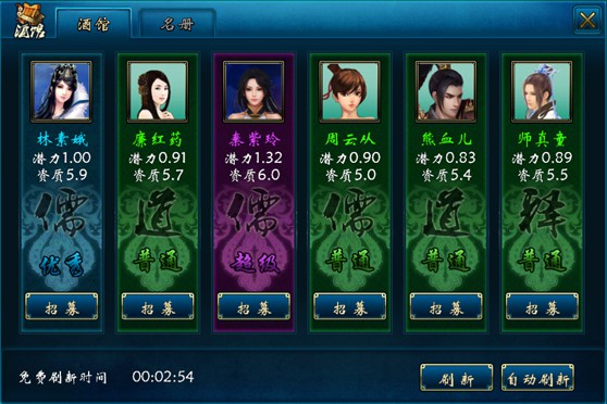 在招募界面左下方有一个免费刷新时间,每1小时有1次免费刷新将领的机会。当免费时间,别犹豫就用它了。酒馆里每次刷新出6名随机将领。当免费时间没有到时,也可以使用仙石或者礼券刷新酒馆。一般手动刷新几次就可以出蓝色品质以上的散仙,自动刷新可以选择将领的品质,以及最大刷新次数。仔细看散仙的“潜力”和“资质”,这是决定散仙强弱的重要标志。