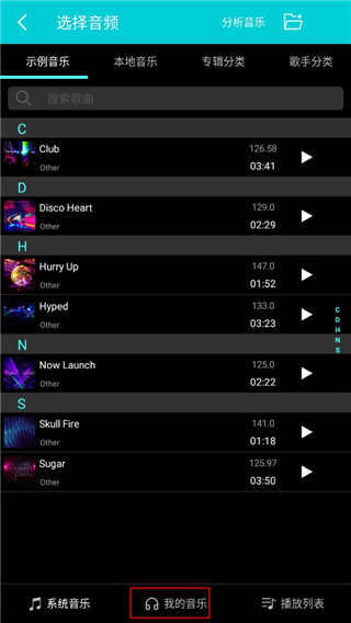 2、进入音乐选择界面后,点击如图所示位置的【我的音乐】按钮。