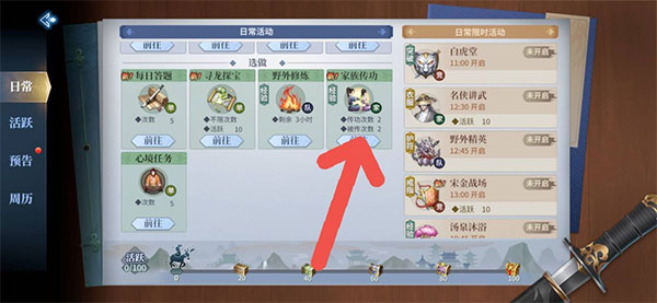 可以看到在活动列表中传功的次数共有被传以及传功2次(吃每天可吃一个家族传功丸增加各一次)传功与被传功皆可获得不少的经验值。