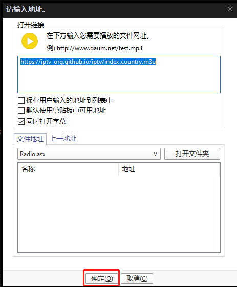 2、将小编给大家准备的直播源链接复制进去,点击确定