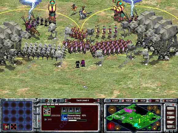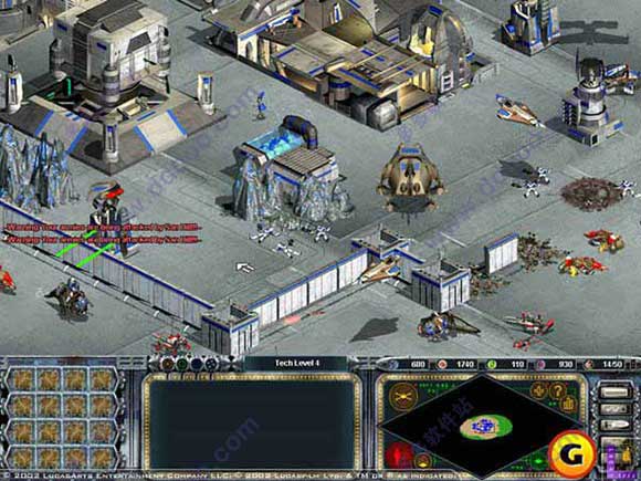 流程:与盟友交往可使玩家获益,而杰迪武士则是该系列里著名的英雄兵种。首先发展基地,若所种农田荒废,则点旁边的工人,然后鼠标右键单击该片废田,只要木材足够(每片田耗50个木材)就能立即获得一片新田;或者,在粮食加工中心,点里面的农田图标,自动排出多个新田序列,只要有田耗完,就自动从该序列中补上。指挥升到第二级后,适时出兵,在基地西北的口子驻守。建空间港,相当于帝国2里的市集,研究holonex tranceiver,即共同视野,与盟友共享探索开的区域。此时即发现Shoran的基地在区域西北,空间港出数部贸易车,集结点设在盟友的空间港,即建立起贸易路线。提防贸易联盟对你的骚扰,增加部队,保护贸易路线。建杰迪修道院,出杰迪武士,赶到盟友营地里,捡起地上的宝物Jedi holocron,并带回到修道院,它象帝国2里的遗迹那样缓慢地增加水晶。完成这一点后,Shoran送来一批铁矿石,随后不久,Shoran的手下发现东北有敌哨塔。派骑兵过去协助清理,大部队跟上。此时应已拥有了多名杰迪武士,这种格斗型兵种能够将敌人的一些部队变过来,操作方法是按C键。清除哨塔后,Shoran率兵往东进军,必须配合他的行动,因为他是不能由玩家指挥却又必须保证其安全的。盟友也持续不断地在增援前线,各兵种相互配合,扫荡场景东北的所有敌设施。对部队编组的方法,也与主流RTS相同,即Ctrl + 0-9数字键,然后按相应数字键即切换为指挥该组部队,连续按两下则切换到看该组部队。注意杰迪武士耗大量水晶,因此要多采该资源。
