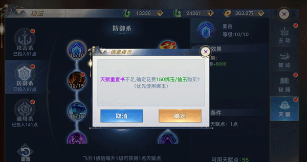 合理分配天数点数可获得更高的属性加成,且天赋点数支持重置,但需要注意进行天赋重置是需要消耗天赋重置书(消耗150绑玉或者仙玉)的哦,上仙大人在不同的阶段可以调整现有天赋点数分配方案获取不同的体验哒~