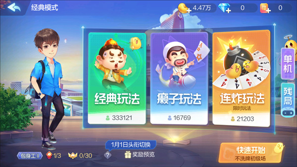 等车、排队、闲暇时间太无聊?不如经典模式快速开一局!拥有经典、不洗牌、癞子、天地癞子四大玩法的经典模式为你提供最纯粹的单局乐趣,