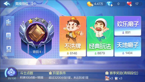 给你三颗心,能否一轮升星冲段?欢乐斗地主排位模式独创竞技分玩法,赢牌只是第一步,加倍、压制、打出特殊牌型都可以为你累积竞技分数,