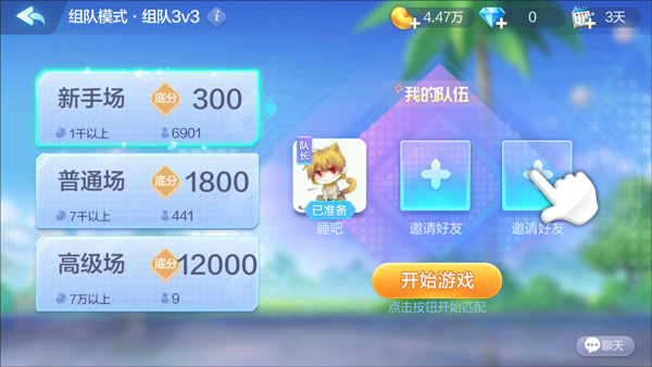 2、包括新手场、初级场、普通场、中级场、高级场、顶级场和巅峰场,我们可以根据自己的欢乐豆多少来选择场次,以【新手场】为例,