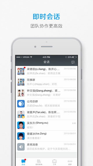 - 支持微信企业号会话服务,与微信消息打通,自由选择工作生活是否分开