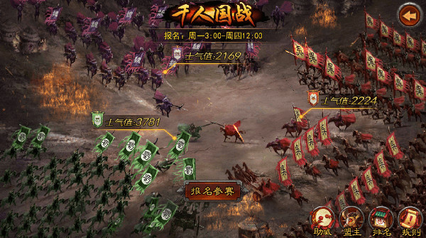 报名功能:【千人国战】以【点将台】为入口,周一3:00至周四12:00为校阅阶段,大家可以在校阅阶段报名参赛、擂鼓助威。在校阅阶段,报名参赛和助威行为都会为本国带来一定数量的士气值。士气值越高,说明人气越高。